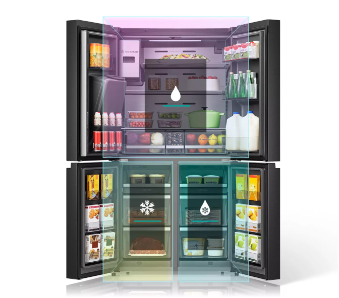 With 3 independent evaporators, our fridge offers triple cooling technology, independently controlling the temperature and humidity in three compartments. This effectively prevents odors from mixing between the fridge and freezer compartments.