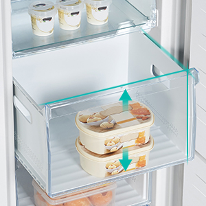 Full width drawer design, not only meet your demand of storage capacity, but also help you can store neatly.Through translucent drawer, it can help you shorten the time of looking for food massively.