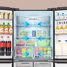 Cool the fridge evenly from corner to corner. Cold air is circulated through the vents on every shelf level, so the fridge maintains a constant temperature and food stays fresh