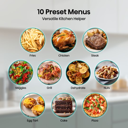The air fryer features 10 preset programs to help you from beginners to master chefs. Just press the preset menu and walk away, and come back to enjoy the fresh meal!